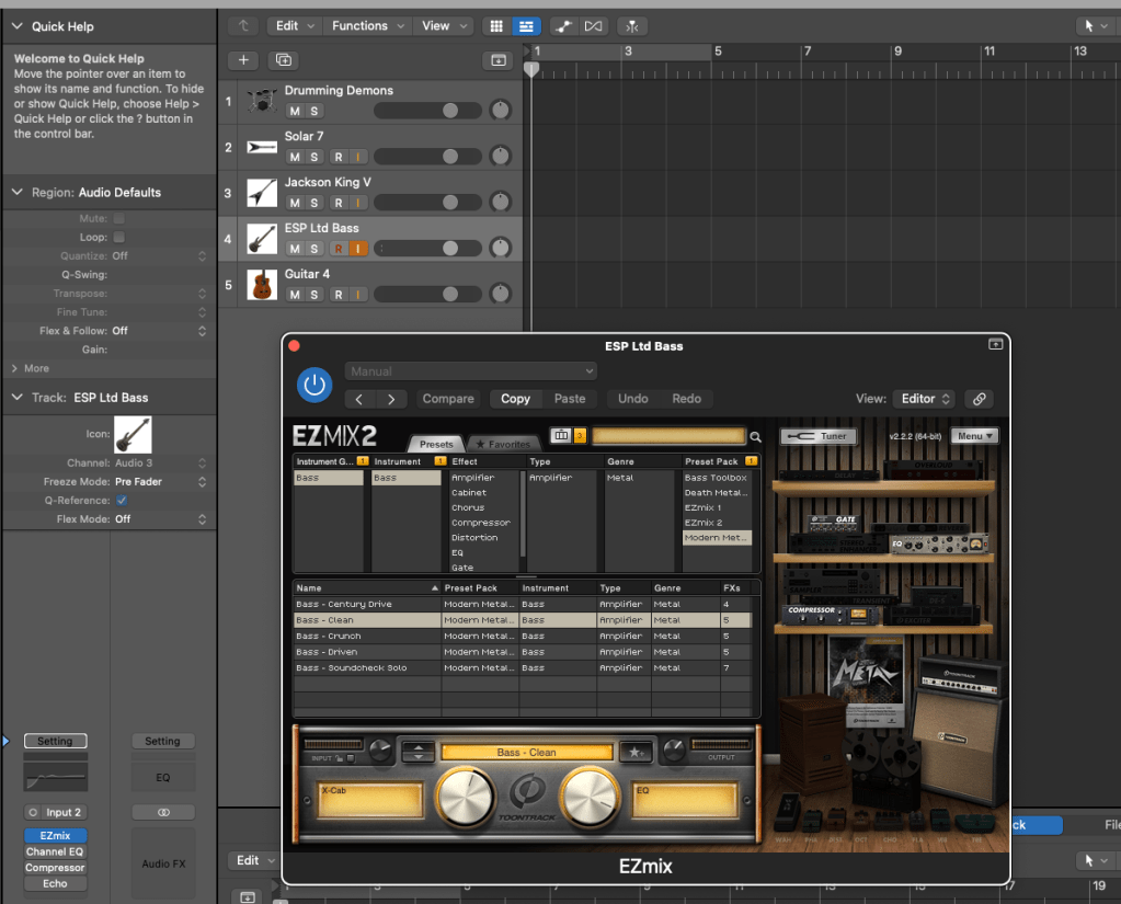 Then comes the low end, currently held down by an ESP Ltd 6-String bass. It’s chunky, ballsy, and holds things together real well without any of that battery for active pick up needs. It’s just, pick it up and thick like a wicked tasty gumbo! Usually for this beast I also use EZMix 2 Modern Metal Pack’s Bass-Clean amp setup.